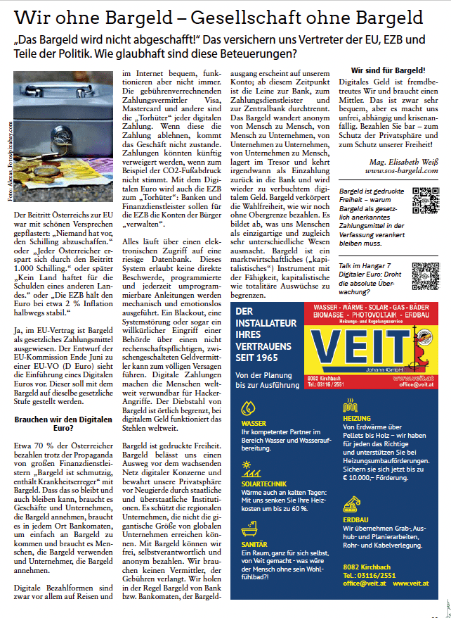 Bargeld ist gedruckte Freiheit. Bargeld belässt uns einen Ausweg vor dem wachsenden Netz digitaler Konzerne und bewahrt unsere Privatsphäre vor Neugierde durch staatliche und überstaatliche Institutionen. Es schützt die regionalen Unternehmen, die nicht die gigantische Größe von globalen Unternehmen erreichen können. Mit Bargeld können wir frei, selbstverantwortlich und anonym bezahlen. Wir brauchen keinen Vermittler, der Gebühren verlangt. Wir holen in der Regel Bargeld von der Bank bzw. Bankomaten, der Bargeldausgang erscheint auf unserem Konto, ab diesem Zeitpunkt ist die Leine zur Bank, zum Zahlungsdienstleister und zur Zentralbank durchtrennt.