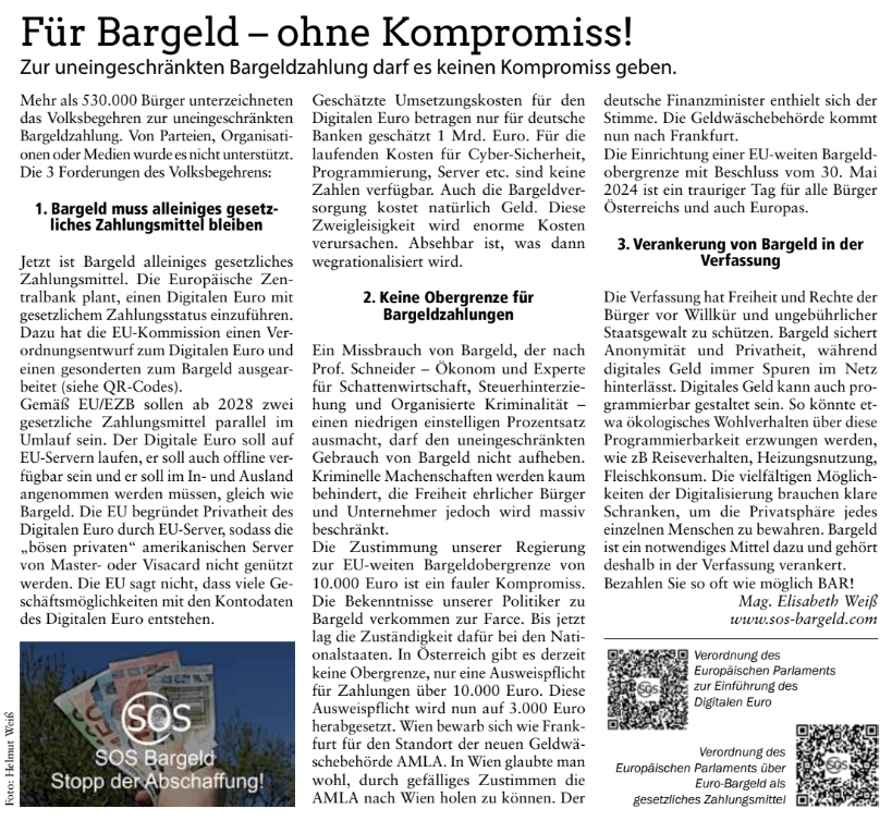 In der neuesten Ausgabe (Sommer 2024) der Kirchbacher Berichte wurde der folgende Artikel von Elisabeth Weiß veröffentlich. Darin geht es um die EU Verordnungen zum Digitalen Euro und zu Bargeld.